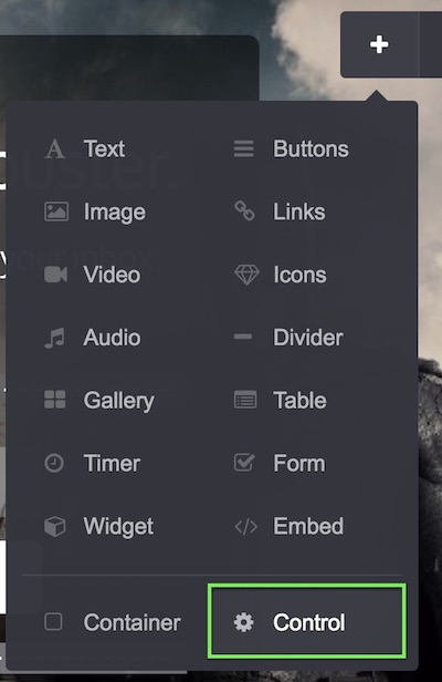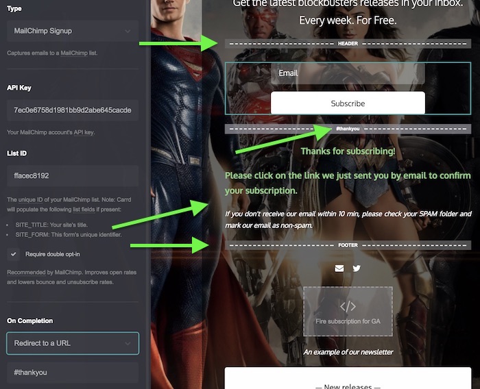 • One control type section break. Name it exactly "thankyou", just like our previous anchor. Place it under your form. Add some text blocks to make the message you want that will appear after the user subscribes.