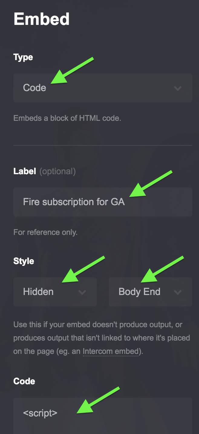 It doesn't matter where it appears on the page. I put it below the footer. Now set the settings type to Code and set the Label to "Fire subscription for GA". (You can call it whatever you want.) Style: Hidden / Body End.