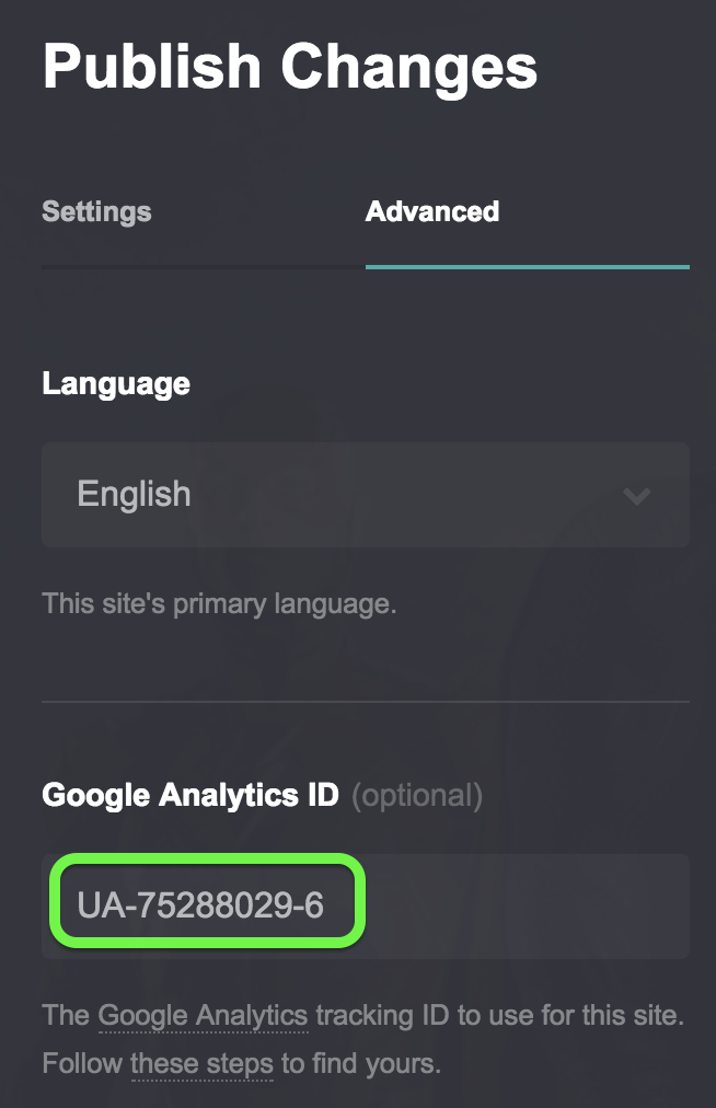 Go back to carrd.co and your website and click the publish button. Then enter your Google Analytics tracking ID in the Advanced tab: