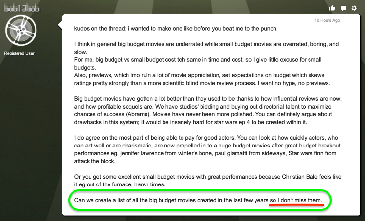 I started a new thread about blockbusters to see if I can have discussions with blockbusters fans like me. I will send them some private message about my idea so I respect the forum rules (no marketing, no spam). I will probably start other threads and talk about forgetting to go to see a movie when it's at the theater for example, I may get some insights from that too.