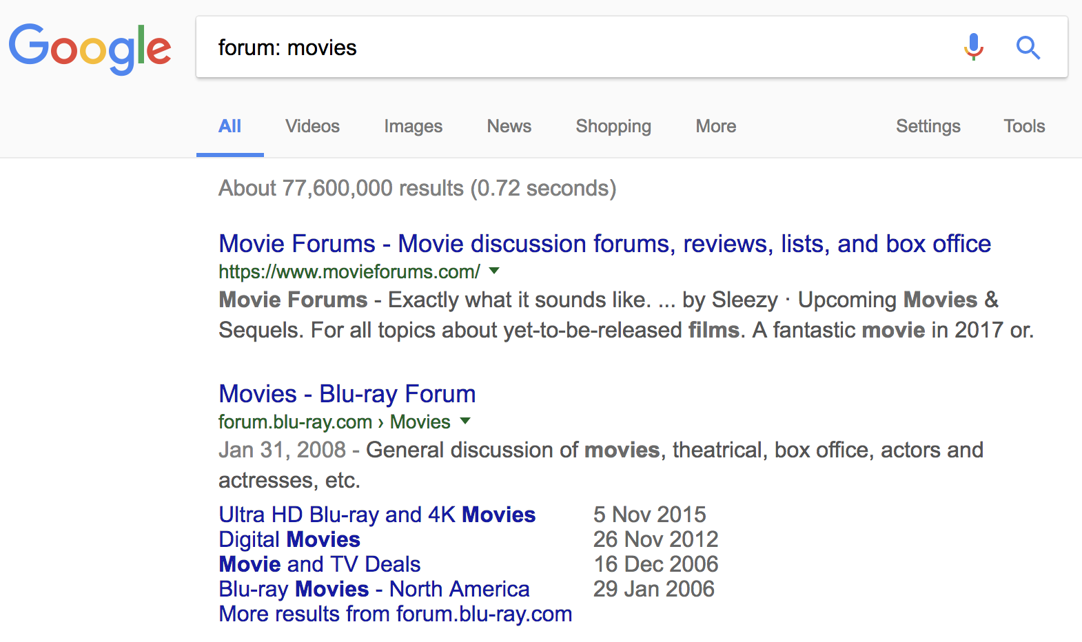- Forums: use the advanced search prefix "forum: <subject>" in Google to filter the results to forums only.