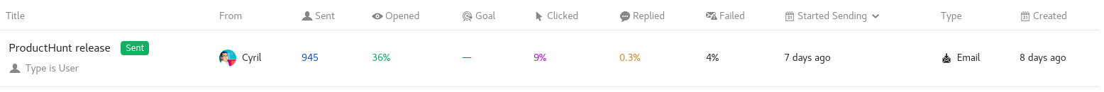 From the 945 emails we sent, 36% of our users opened it (not that bad) and 9% clicked. This means 85 users went to see our ProductHunt profile. Unfortunately, we don’t have a way to know how many of them clicked on the upvote button, but it’s fair to assume that a good percentage of them did it (the difficult bit was done).