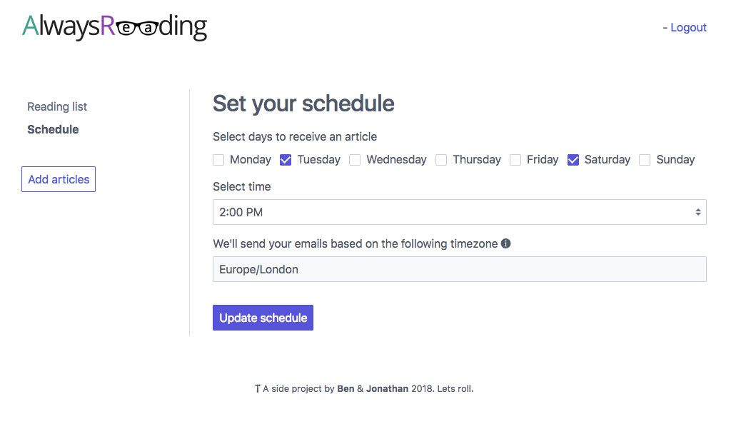 What we've built is www.alwaysreading.io which is a simple web app that allows you to queue up articles/blog posts (anything online) that you've been meaning to read but haven't got around to yet. The way it works is that you just paste in links to the articles you've got lined up to read and then set up a schedule for how often you'd like to be sent one of these links. We'll then send you an email, based on the schedule you set up, with a link to one of your articles. Once you read the link, we'll mark it as read and queue up the next one!