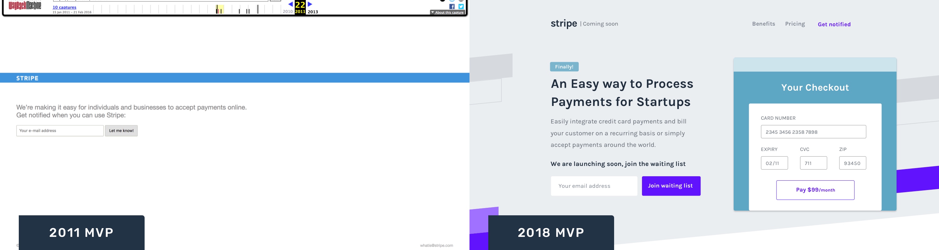 Here’s a sneak peek of what Stripe’s page should look like if they were launching there MVP today (assuming the same payment technologies from 2010 otherwise they would have several competitors already)
