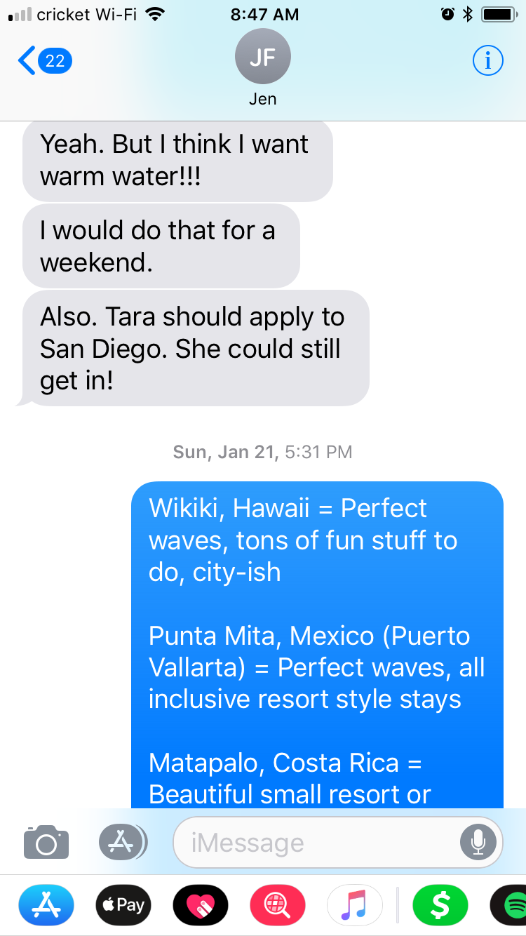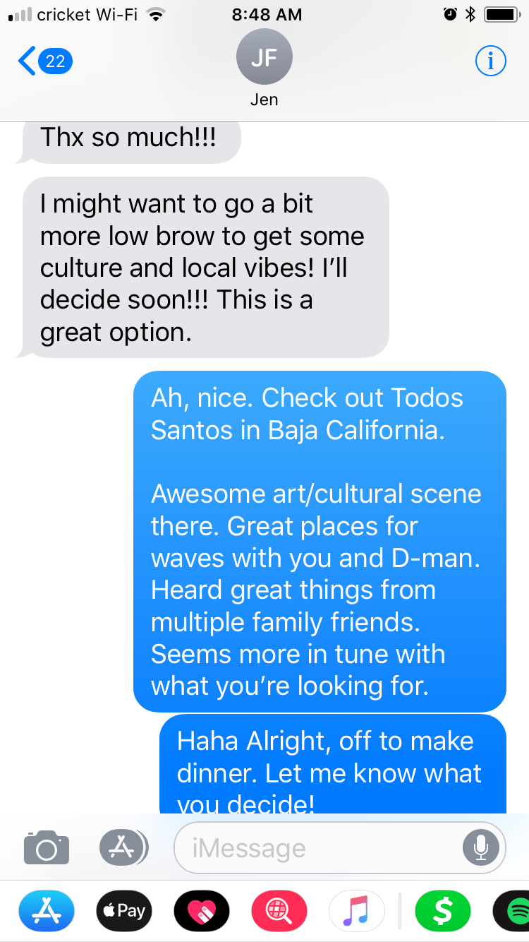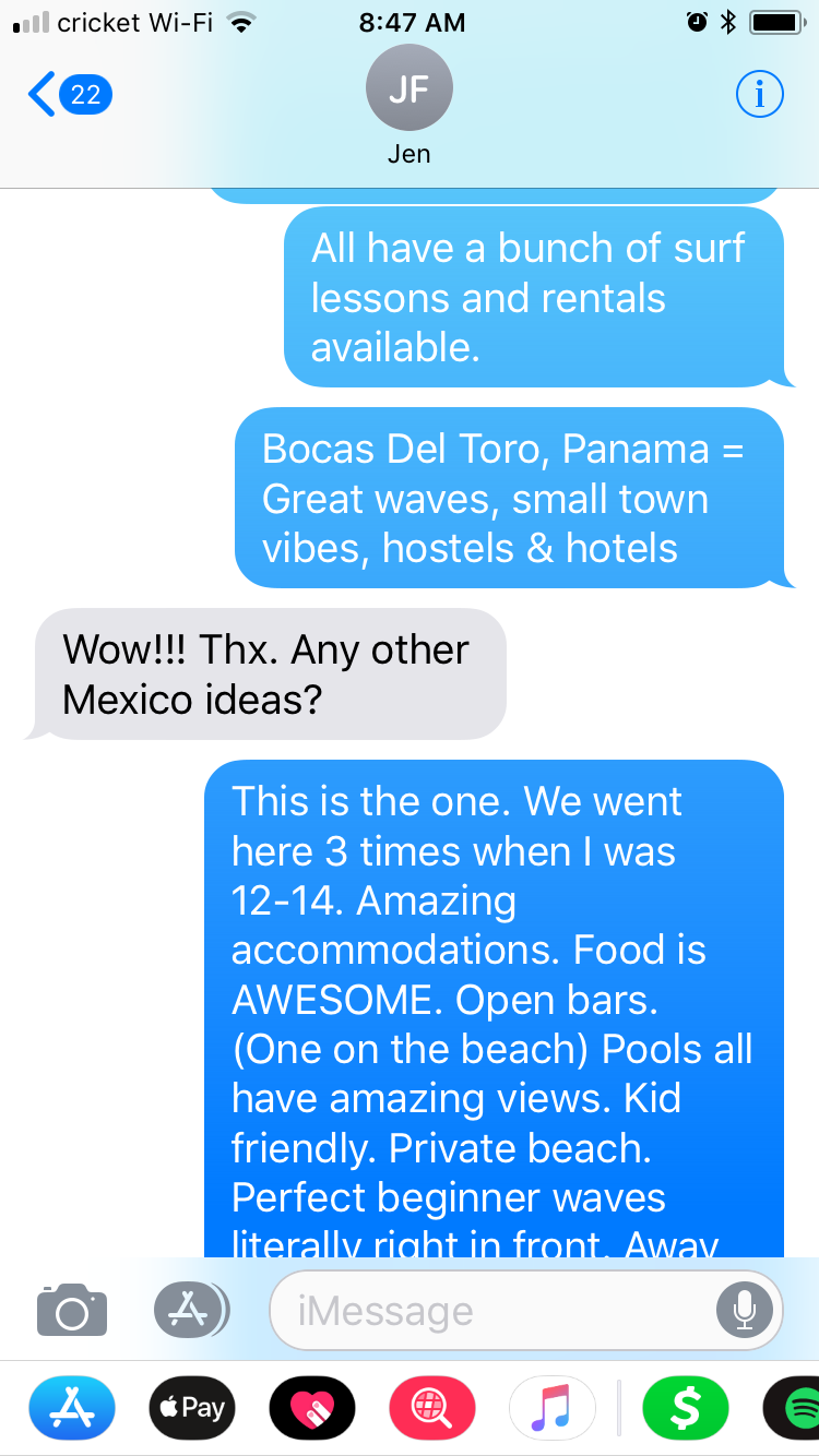 As I started giving her surf destinations, she gave me more tips on what she was looking for and I responded with a few more locations till we found something she liked.
