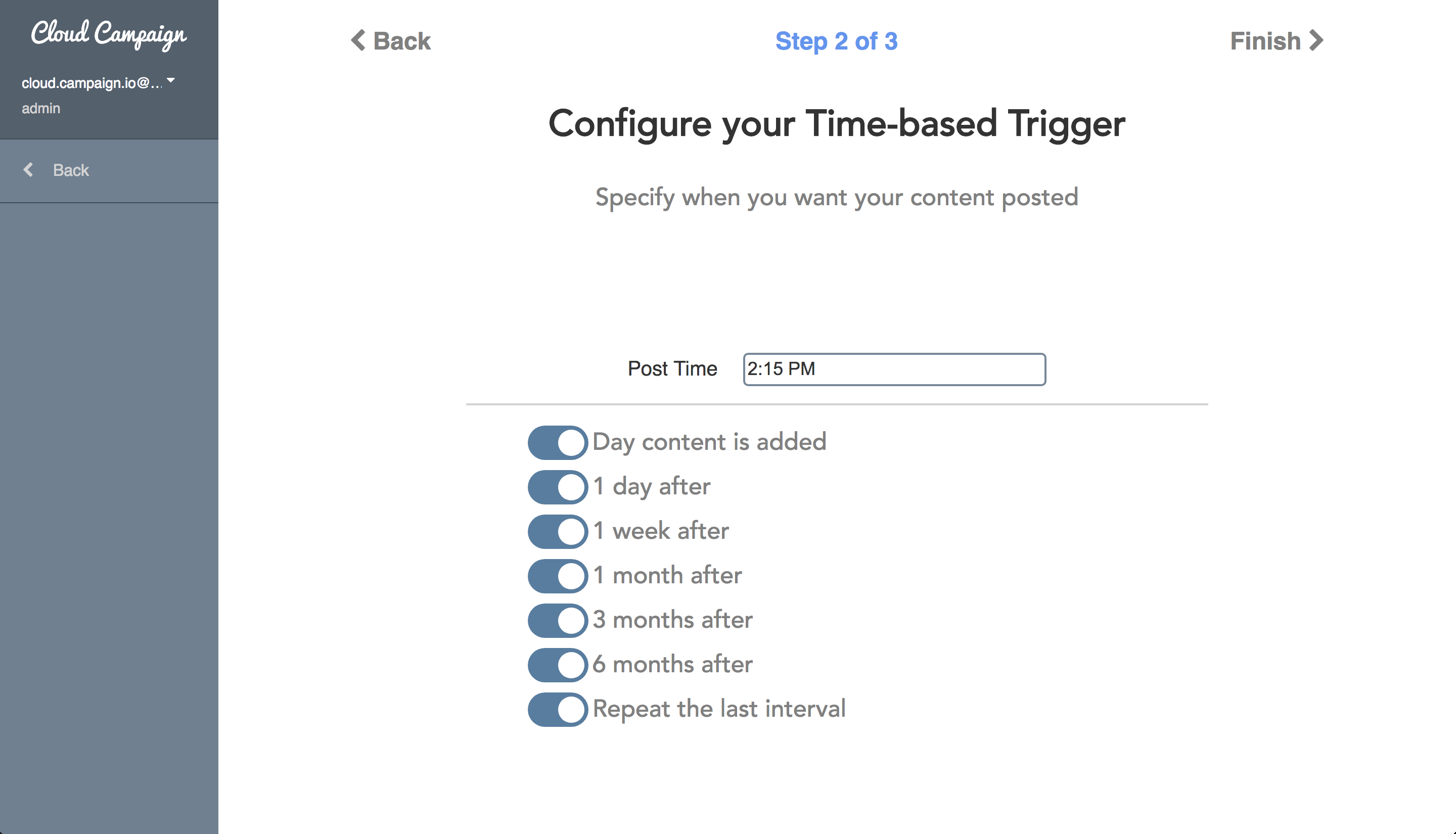 Screenshot: http://static.cloudcampaign.io/img/dynamic_interval_schedule.png