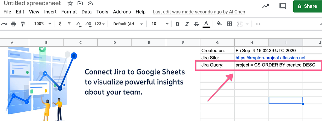 Your new Google Sheet will contain two worksheets: About and Your Jira Issues. The About page just contains some images about using Jira Cloud for Google Sheets (useful if you want to keep data in-sync from Jira to Google Sheets). The Jira Query shows up on this worksheet which is useful if you are using Jira Query Language (JQL) to query your Jira project and/or using the Jira Cloud for Google Sheets add-on.
