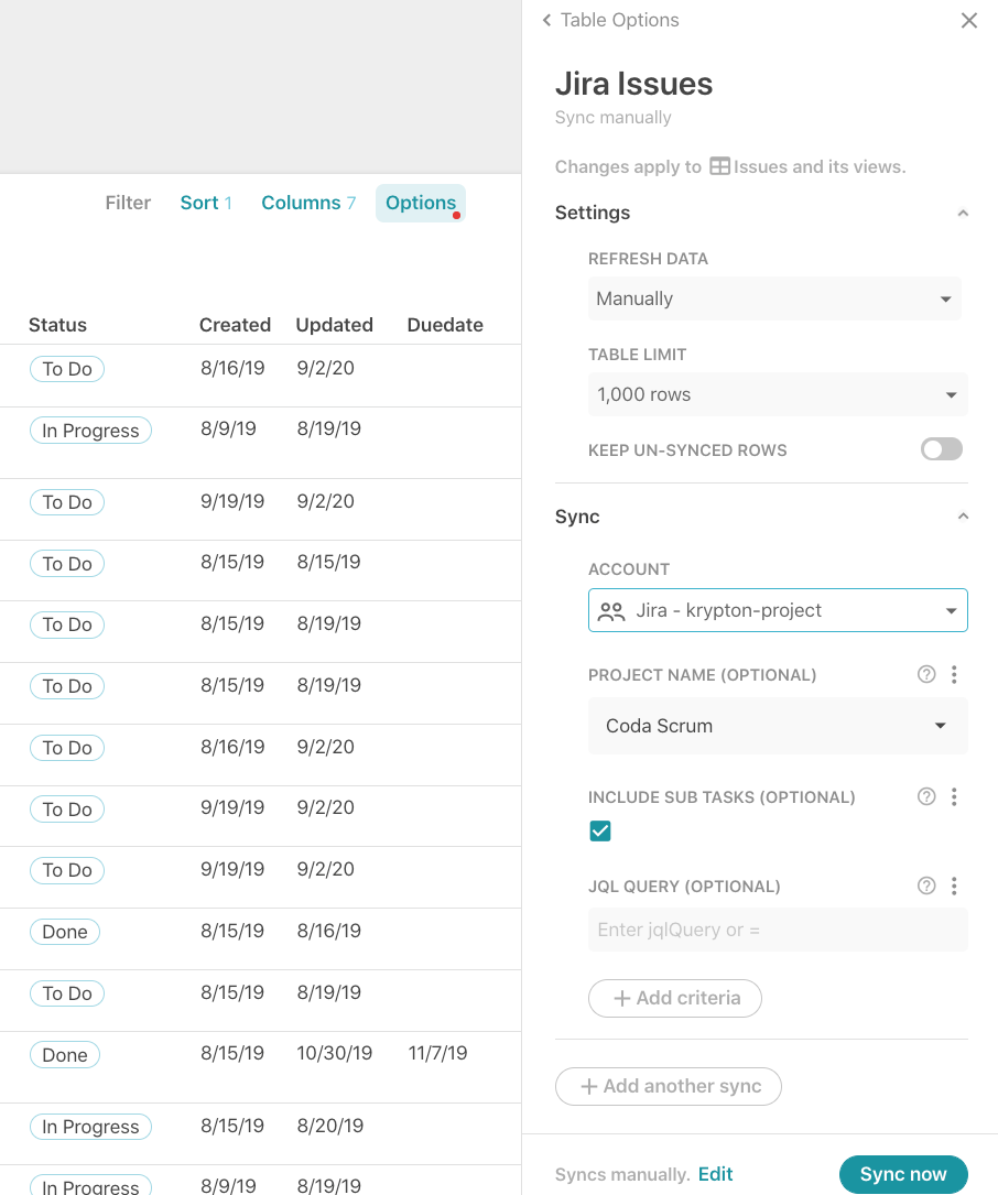 When you click on the Options in the table, there are a variety of settings that let you control how often data is synced over from Jira and what data is actually synced over: