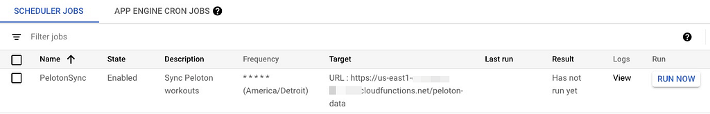 is where you need indicate the cron rules for how often you want Cloud Scheduler to ping the URL. In the above screenshot, this job would run every minute. A helpful site to figure out what characters you should put for the cron rule is https://crontab.guru/. Once this is all set up, you can get detailed logging on your job and see manually run the job from the main Cloud Scheduler interface: