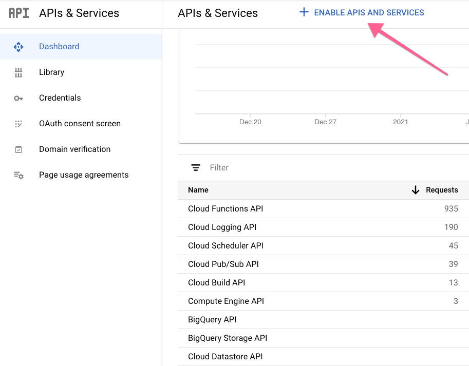 Just setting up Google Cloud to get one Cloud Function to run was a bit of a pain. In addition to setting up a billing account (requires credit card) and tying a project to a billing account, you need to enable the Cloud Functions and Cloud Scheduler APIs (two services we need) to even start using Cloud Functions: