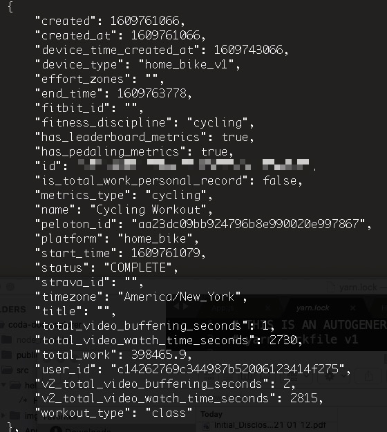The problem : We need to make various other calls to the API and those calls won’t be authenticated. Peloton won’t just give you workout data for anyone just because you know their Peloton username. This is where the cookie for the login session comes into play: