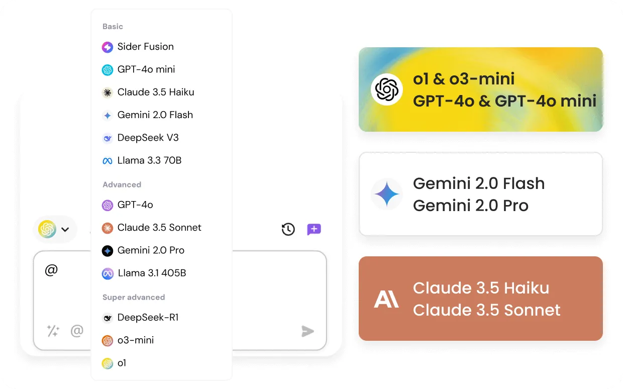 Sider integrates iconic AI models into a single chatbot, like o4-mini, o3, GPT-4.1 mini, GPT-4.1, DeepSeek, Gemini and Claude. Get ready to explore the distinct capabilities of these different AIs!