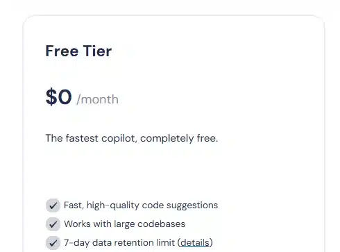 ![Pricing plan card showing 'Free Tier' of "Supermaven" with a cost of $0 per month, offering benefits like fast, high-quality code suggestions, compatibility with large codebases, and a 7-day data retention limit.]
