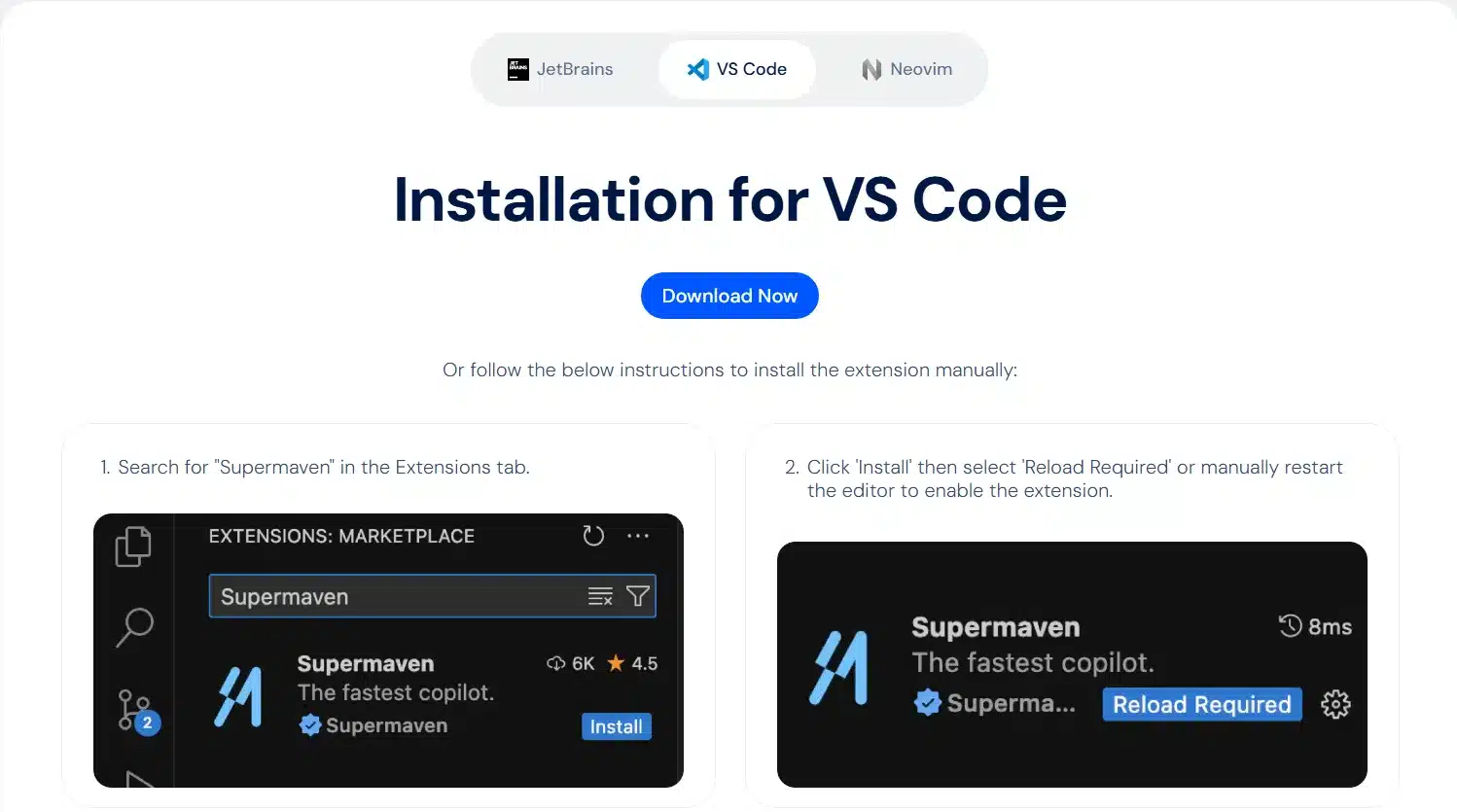 ![Instructions for installing the "Supermaven" extension in VS Code, including searching for it in the Extensions tab, installing, and reloading the editor if needed. A "Download Now" button is also visible. Also instructions for Neovim and JetBrains are available but hidden.]