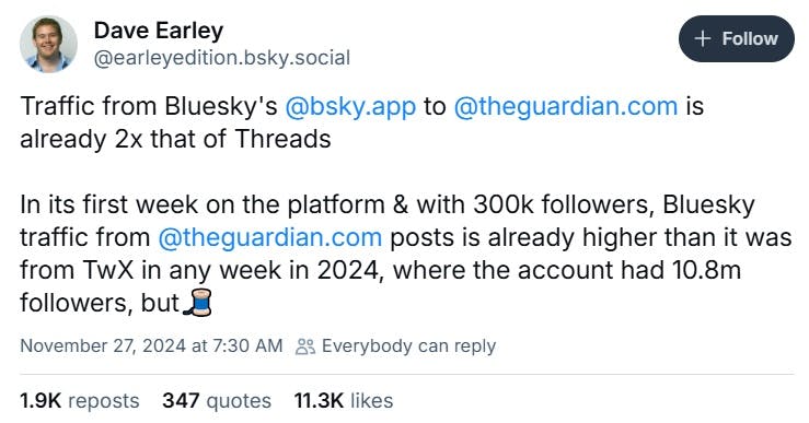 Dave Earley from Guardian Australia said their posts on Bluesky brought more traffic to theguardian.com in its first week than any week on X this year. He also mentioned that Bluesky got them at least twice as many visits as Meta's Threads.