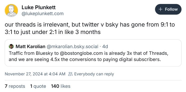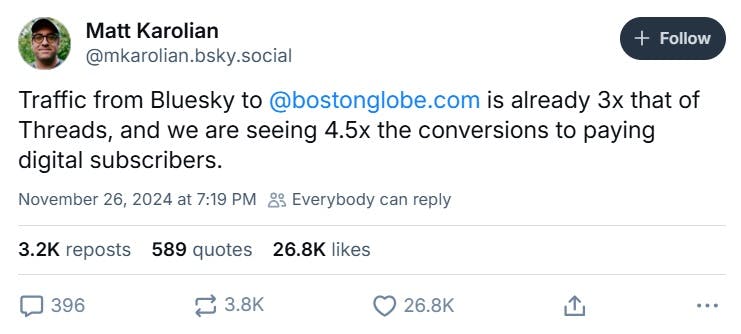On the same day, Matt Karolian from The Boston Globe revealed they're seeing three times more traffic from Bluesky than Threads, and four and a half times more conversions to paying digital subscribers.
