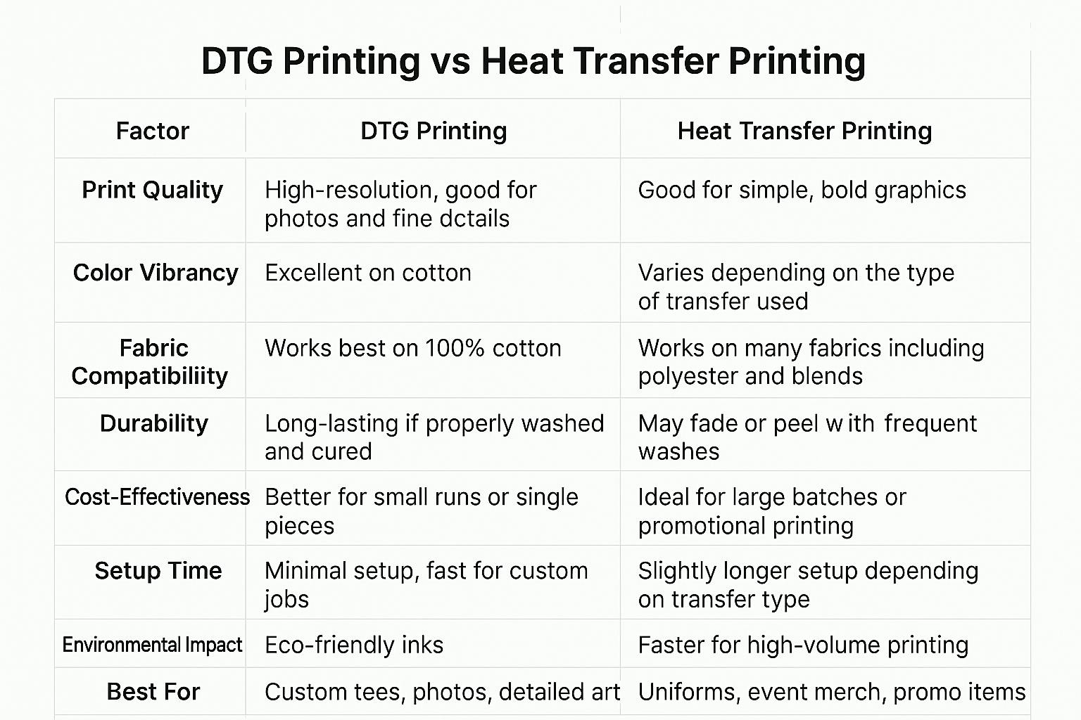 When comparing DTG vs heat transfer printing, it all comes down to your specific needs. DTG is perfect for soft, photo-like prints on cotton apparel, while heat transfer shines for bold designs and printing on multiple fabric types.