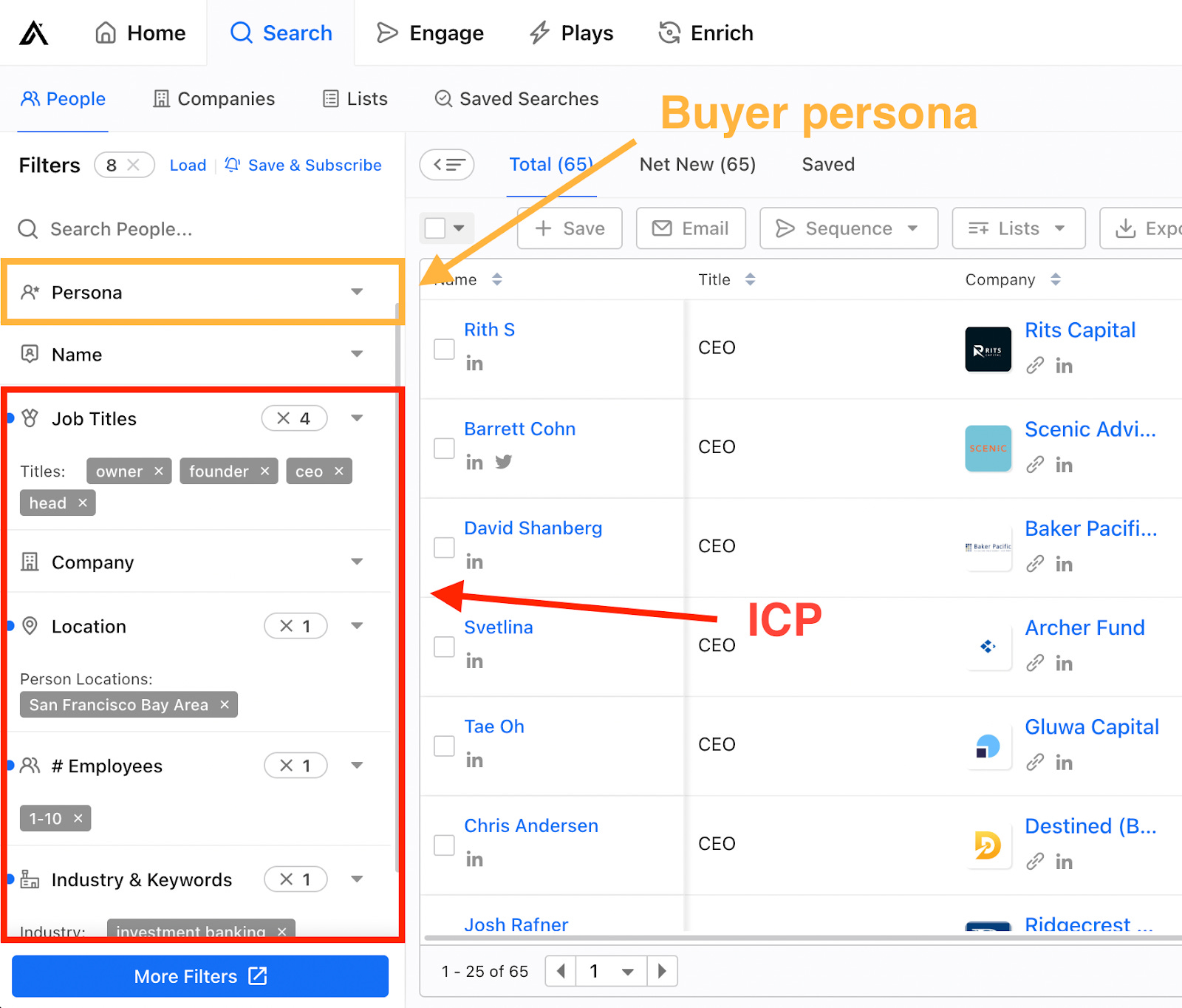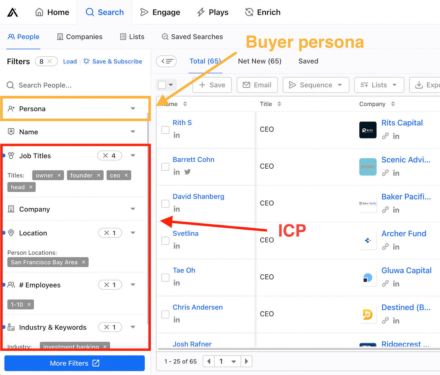 Note: Although it also mixes the attributes of ICPs in the persona tab, the overall functionality of apollo.io is excellent.