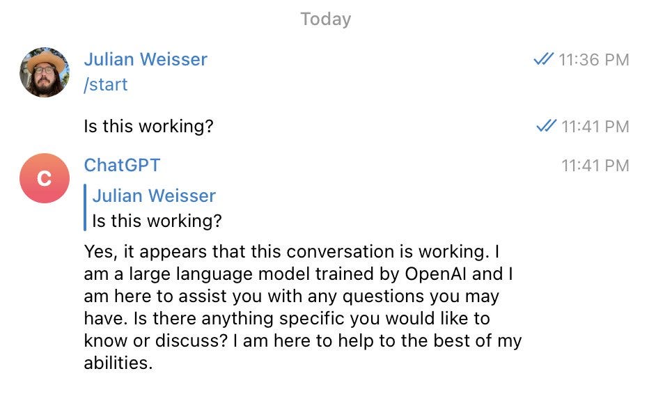 I'm really enjoying playing with ChatGPT. Feels like it's opening my mind to what AI will help us accomplish as individuals and groups. My former ConstitutionDAO teammate Miguel released an open source repo for a neat Telegram bot. I made a guide for setting it up.