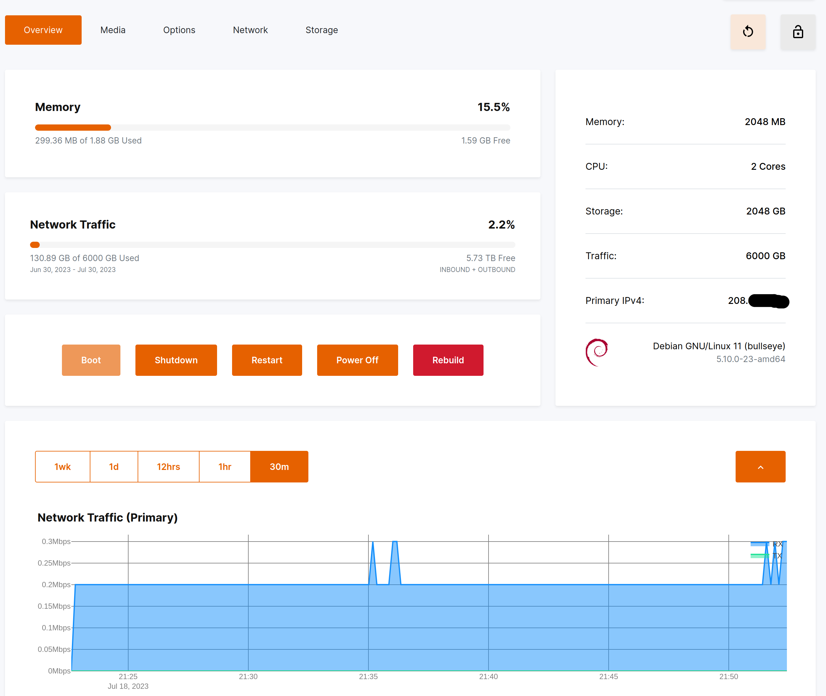 Here's a snapshot of it. You can manage power on your system, check usage graphs, do re-installs, and manage reverse DNS from here. Oh, and you can activate a VNC virtual console too which is nice when you screw up the firewall rules like I totally never have done, ever.