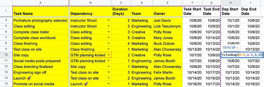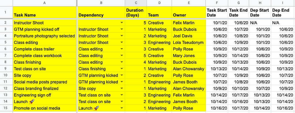 The list of tasks and dependencies in this Google Sheet will be the same list of tasks I try to replicate in every other platform. Copy the Google Sheet I show in this example if you want to use this for your own team.