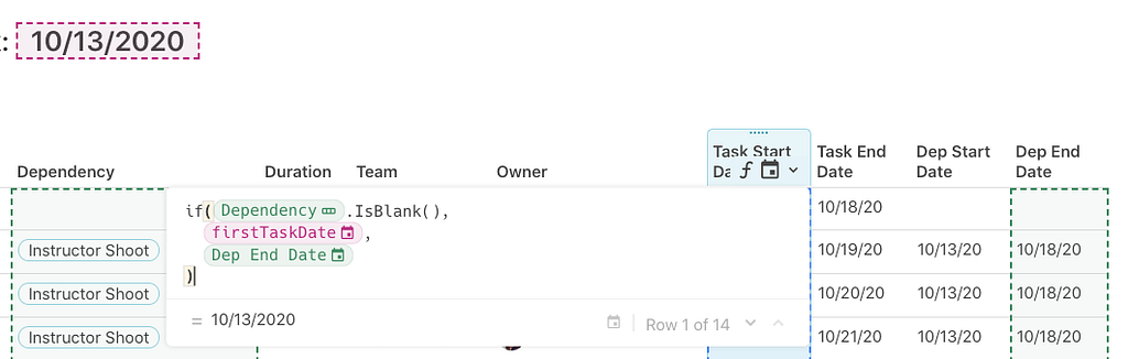 , we’re getting close to mimicking the Google Sheets structure. Then came the issue of trying to build the formula for the Task Start Date