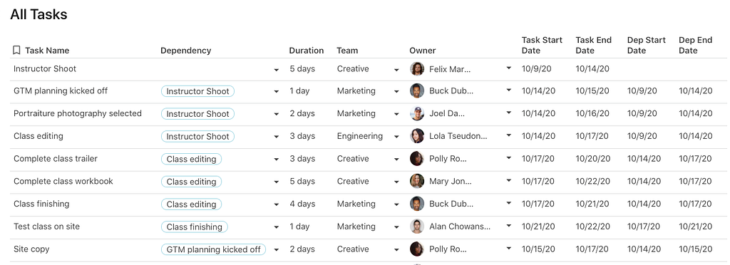 date picker, you’ll see all the task and dependency dates automatically re-adjust based on the start date of the “Instructor Shoot” task. This is similar to adjusting the first hard-coded start date in Google Sheets, moving the “dependency chain” in Wrike, and shifting the gantt chart in Smartsheet: