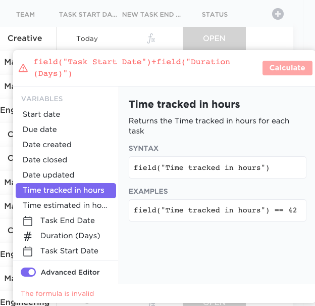 You can switch to the “Advanced Editor,” and start selecting other columns to create a more custom formula. My hunch for why this formula doesn’t work is because the Duration