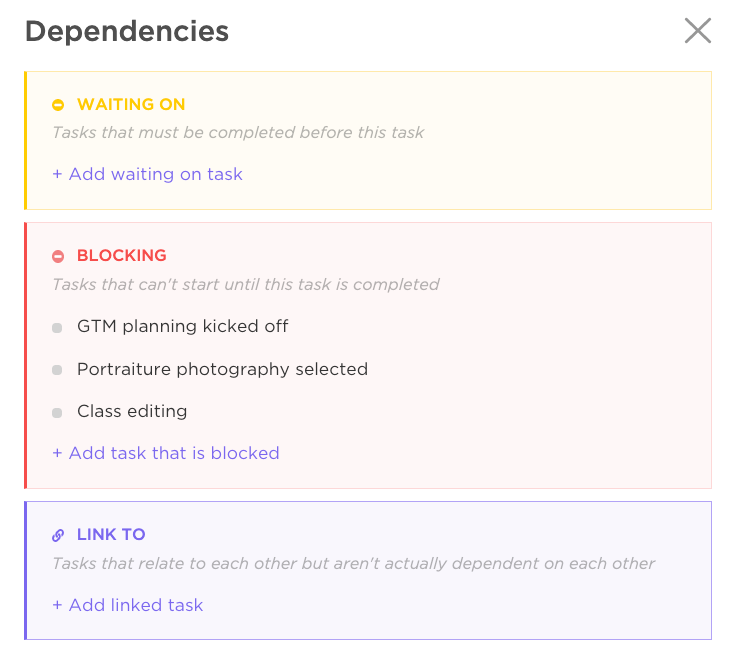 I found this YouTube video pretty helpful in terms of explaining the importance of task dependencies overall rather than explaining how to use ClickUp itself.