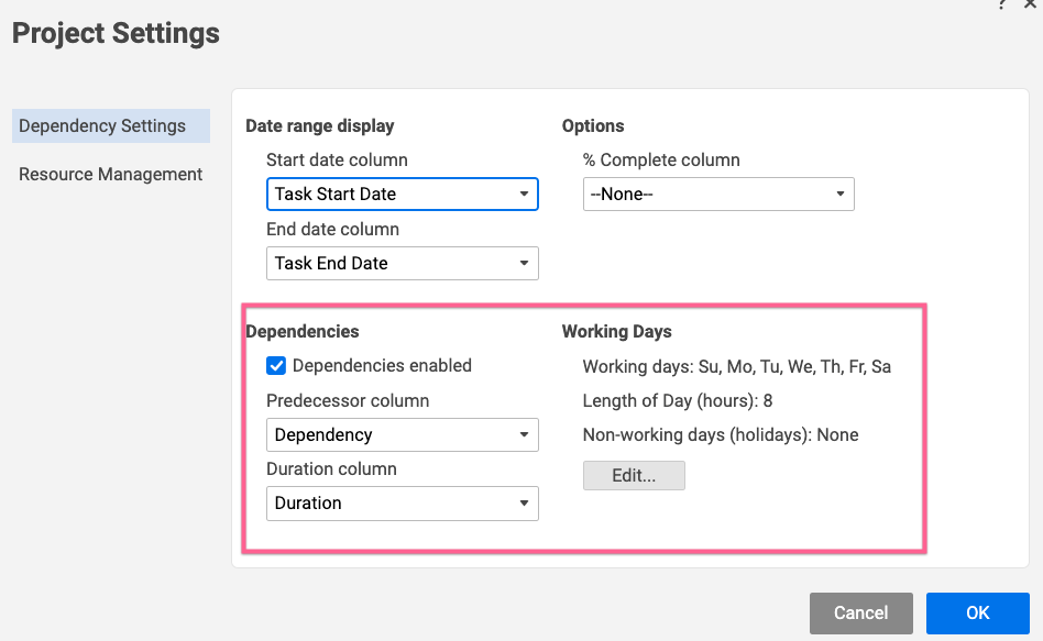 To incorporate dependencies for each task, you have to go to the Project Settings and explicitly enable Dependencies. Through these settings, it’s clear that Smartsheet has iterated over the years to provide users with a defined set of options when it comes to setting dependencies.