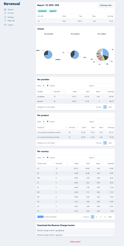 Revenual aggregates sales data from Google Play, AppStore (and hopefully in the future: Stripe, Paypal, Google Adsense) and generates reports and the reverse charge invoices.