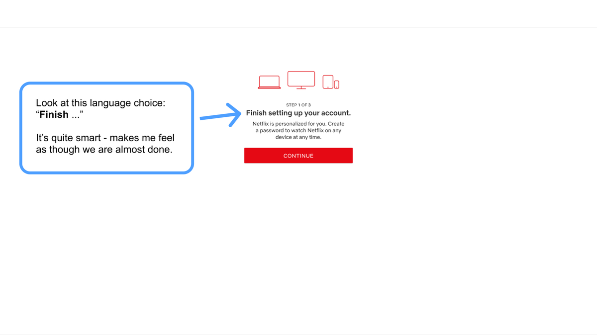 Netflix uses words like "finish setting up your account" when we are only getting started. This makes it feel as though the process won't take long