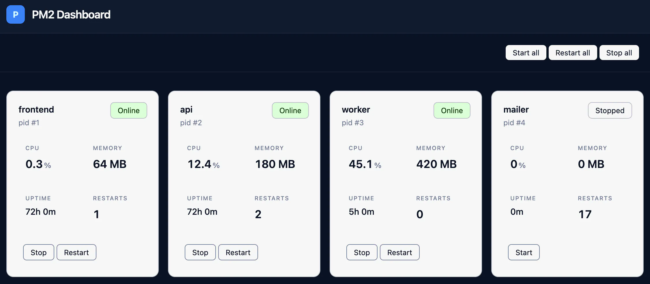 PM2 is the most popular process manager for Node.js, with 2 million downloads per week, but it's provided as a CLI tool. If you want to view processes in a browser, manage them, and receive notifications via Slack or email, you need to use PM2 Plus. This is a paid, subscription-based cloud service.