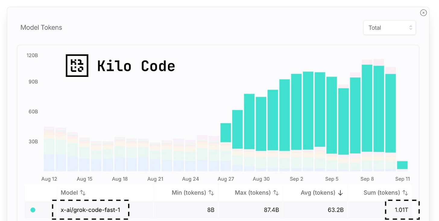That’s exactly what’s happening with Grok Code Fast 1. In the last few days alone, Kilo Code has processed over 1 trillion tokens with this model: