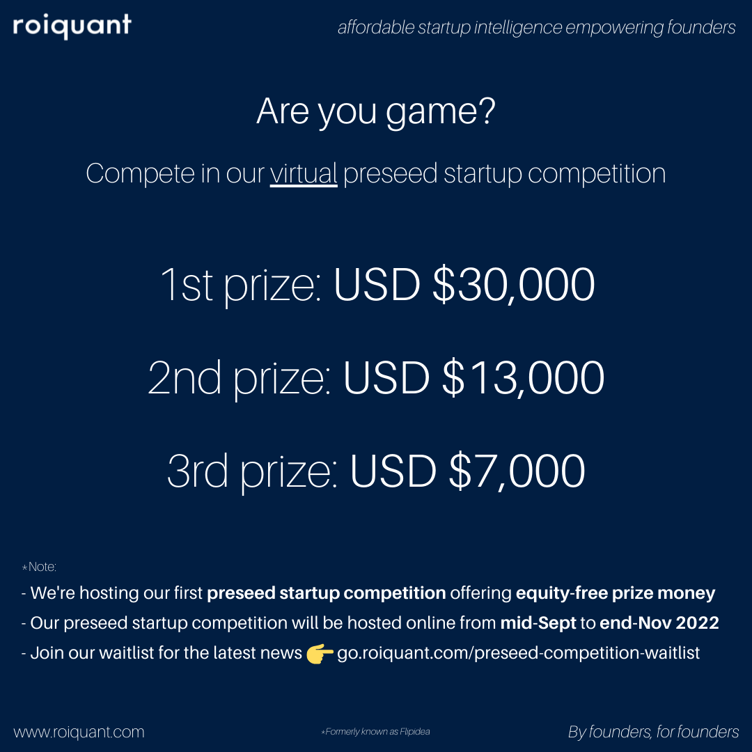 Hey everyone, we'll be hosting our first virtual preseed startup competition in mid-Sept to end-Nov 2022.
