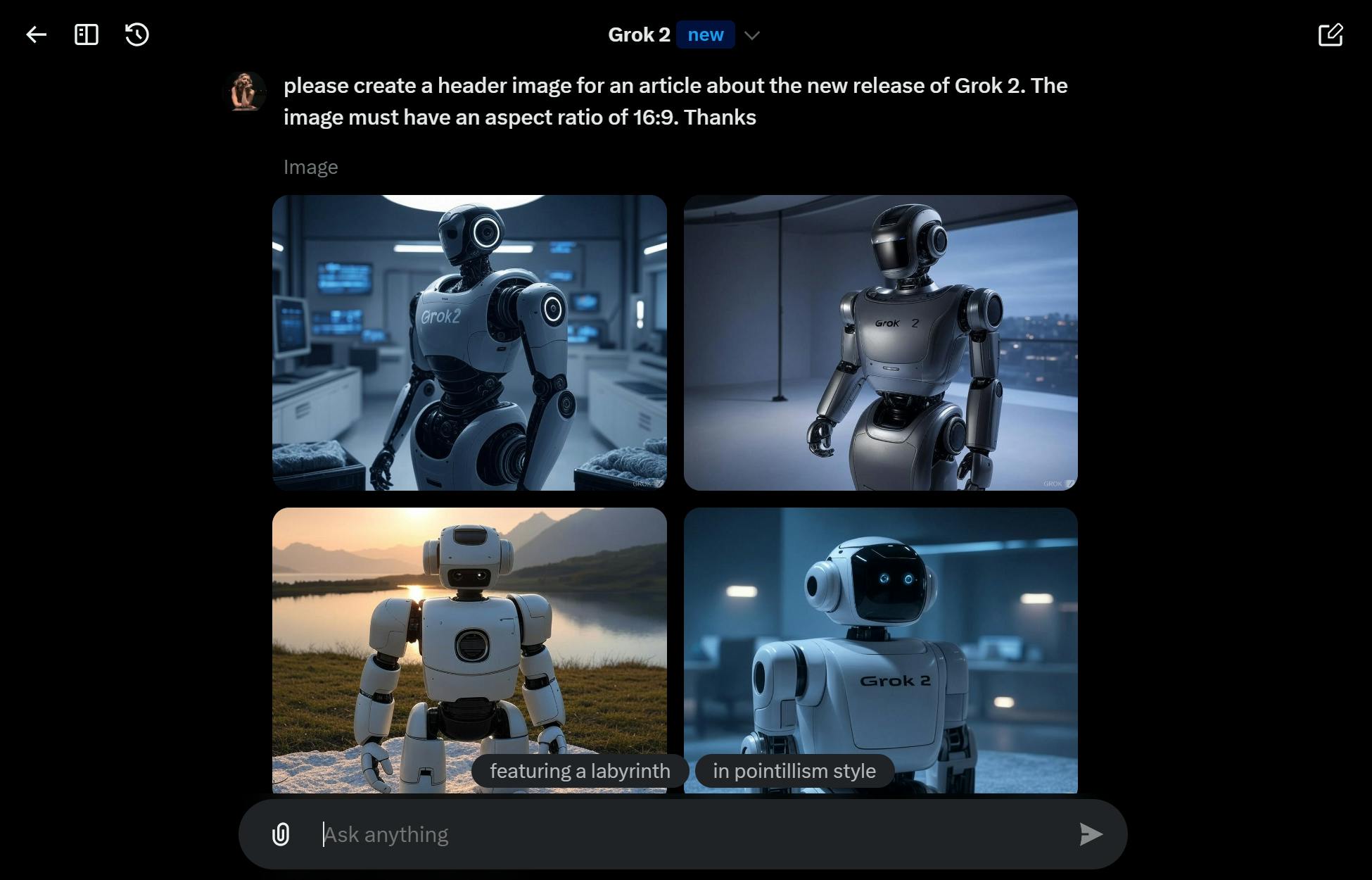It uses xAI's new Aurora model to generate images, all of which are watermarked with "Grok-2."