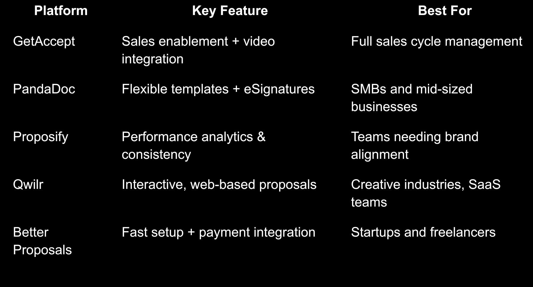 With tools like GetAccept, PandaDoc, Proposify, Qwilr, and Better Proposals, businesses can ensure they deliver proposals that are not only professional but also persuasive and interactive. In an era where every second counts, adopting the right platform can mean the difference between winning and losing a deal.