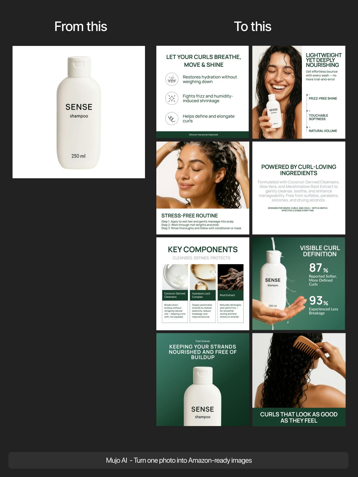 From one product photo → a complete listing (gallery + copy), ready for Amazon/Shopify/Etsy.