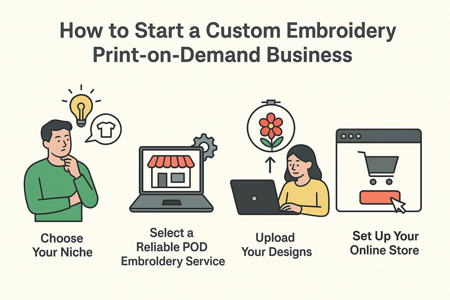 Starting a custom embroidery print-on-demand business is easier than ever today. With the right strategy, you can create a brand that offers premium products without worrying about inventory, equipment, or bulk costs. Here’s how you can get started: