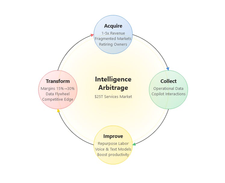 The real opportunity isn't just in building AI or buying companies - it's in creating entirely new financial structures that can turn the $25T services market into tomorrow's software businesses. That's the intelligence arbitrage.
