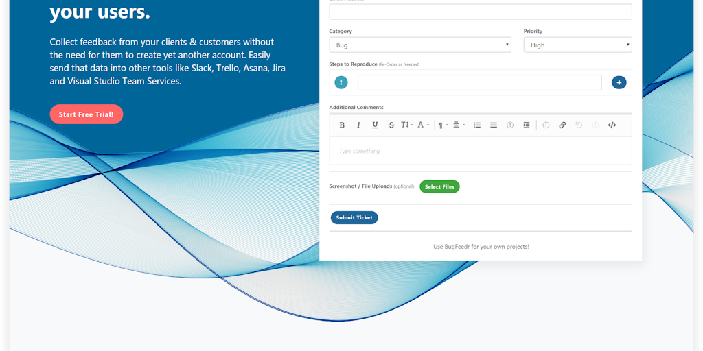 Sometime toward the end of 2017 we decided to start expanding BugFeedr into a more polished service. The biggest new feature was adding in integrations to Slack, Trello, Jira, Asana and Visual Studio Team Services.
