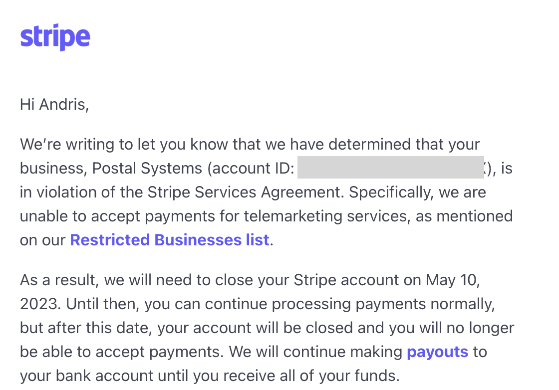 It appears that Stripe has categorized my business, EmailEngine, as a "telemarketing service," which is against their policies, resulting in the closure of my account. I hope I can clarify that EmailEngine is not related to telemarketing. Instead, I offer software subscriptions that enable integration of incoming emails with SaaS CRM and similar services. It's a significant challenge to run a business when many people don't understand its purpose. 🤷‍♂️