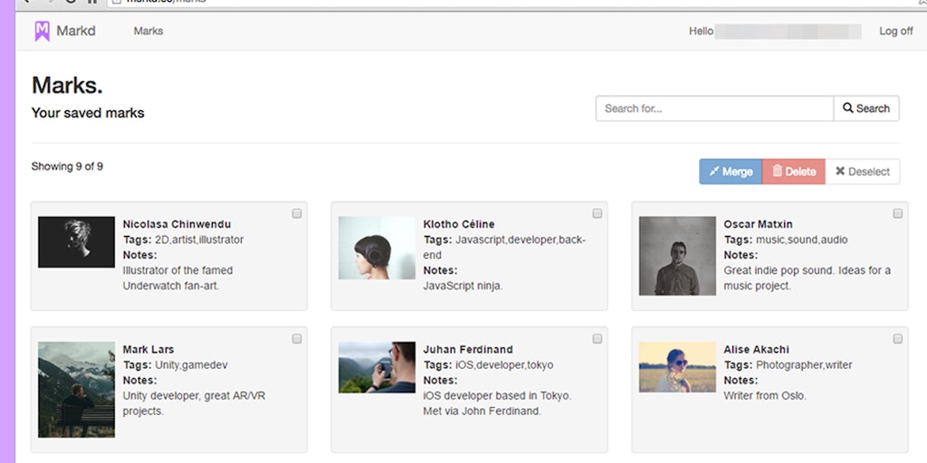 I used to keep track of people I want to work with (designers, programmers, artists...etc.) on a giant spreadsheet. Talents exist on various platforms and there wasn't a simple way to save them all - so we made Markd.