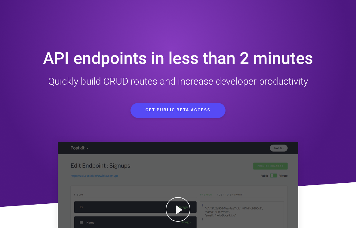 Born out of my own frustration as a developer, Postkit allows development teams to design API endpoints so they can build apps and websites quickly and efficiently.